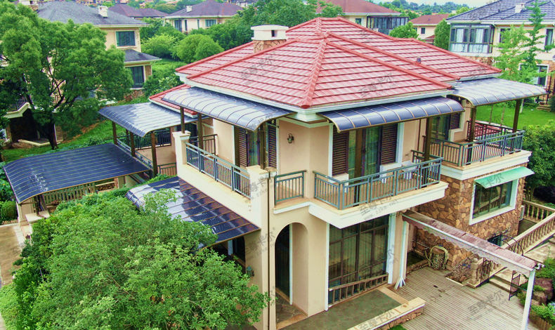 這套雨棚,包括別墅陽臺雨棚在內,全部選用了鋁合金骨架+聚碳酸酯板頂棚材料,搭配而成。